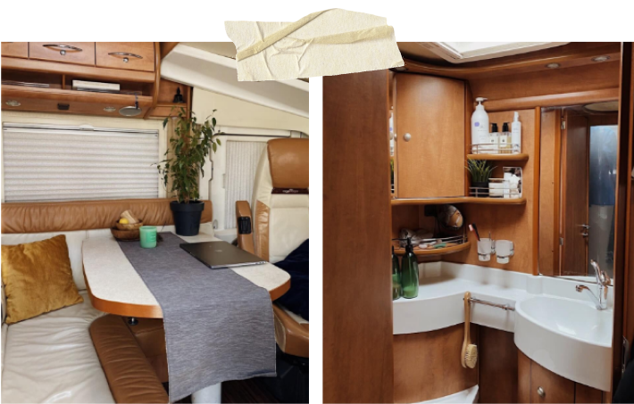 Есть кухня с плитой, раковиной, холодильником и хранением еды и принадлежностей. Зона со столом и диванами, где мы едим и работаем. Спальня с двуспальной кроватью и шкафами и полками для хранения одежды. Есть телевизор и плейстейшн. Душ с горячей водой, туалет, умывальник. Багажник-гараж. Сейчас у нас там велосипеды, гриль. В России возили с собой мопед.